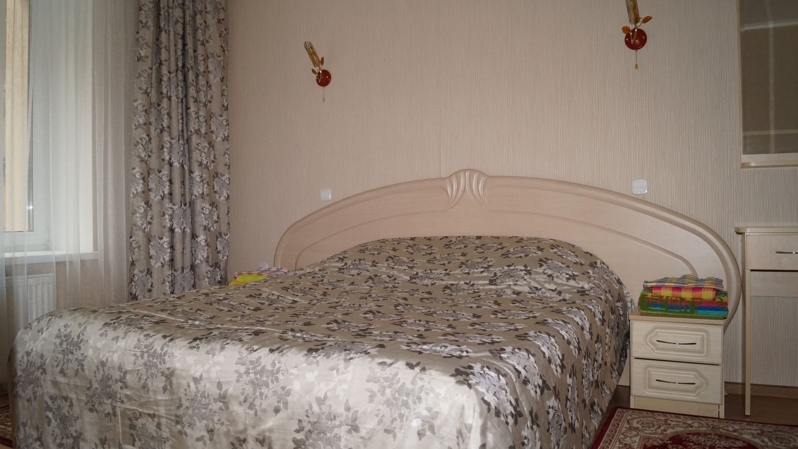 Площадь номера - 36 кв.м. 2 осн. места. 2 доп. места. Мебель: вешалка, диван раскладной, зеркало, кровать двуспальная, прикроватные тумбочки, стол, стулья, шкаф-купе. Оборудование: набор посуды, телевизор, утюг, холодильник, чайный набор посуды, электрочайник. Санузел: с душевой кабиной, туалетные принадлежности, фен. Сервис: смена полотенец, смена постельного белья, уборка номера.