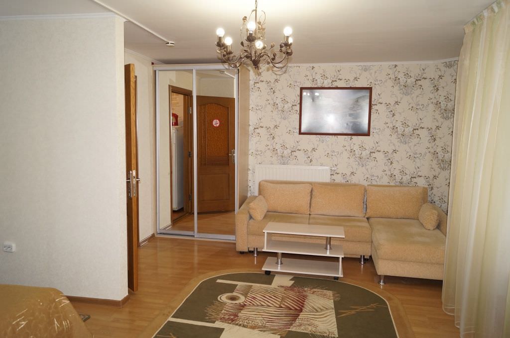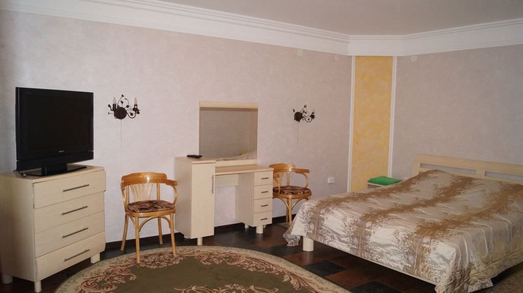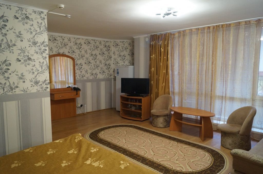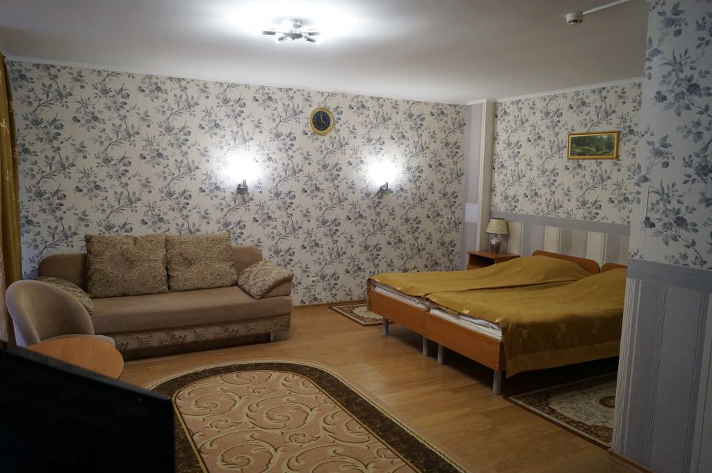 Площадь номера - 37 кв.м. 2 осн. места. 2 доп. места. Мебель: вешалка, диван раскладной, зеркало, кровать двуспальная, прикроватные тумбочки, столик журнальный, столик туалетный, стулья, тумба, шкаф-купе. Оборудование: набор посуды, телевизор, утюг, холодильник, чайный набор посуды, электрочайник. Санузел: с душевой кабиной, туалетные принадлежности, фен. Сервис: смена полотенец, смена постельного белья, уборка номера.