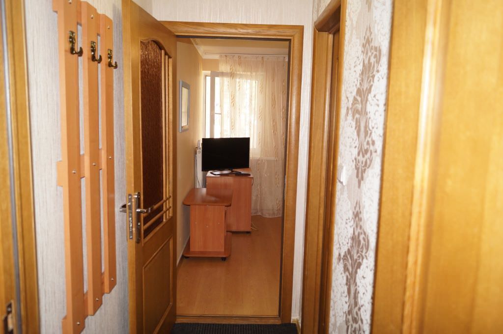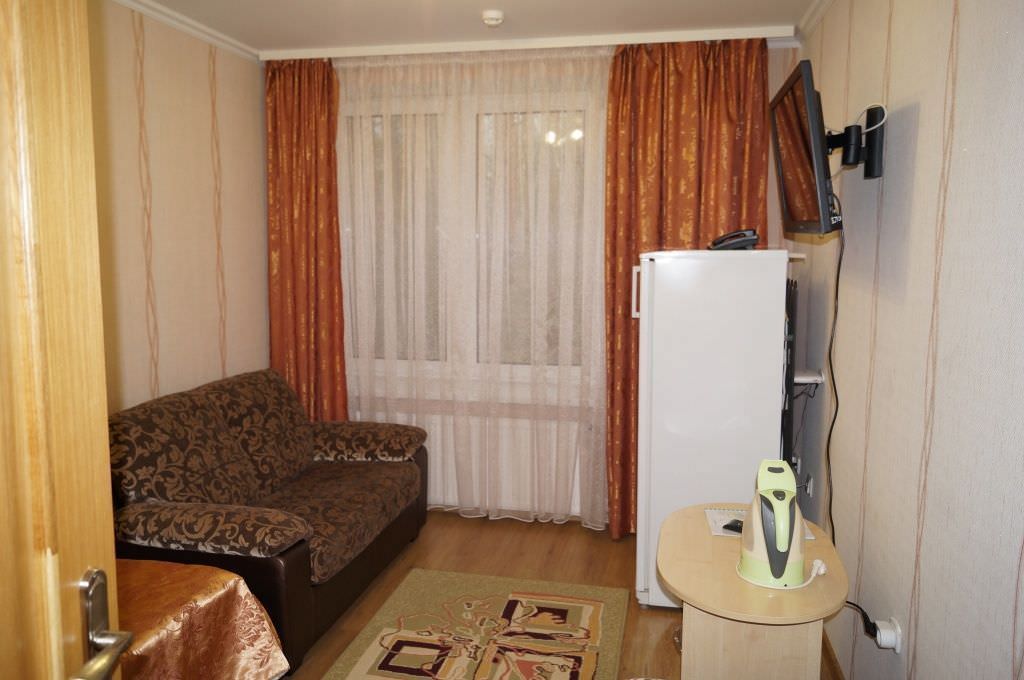 Площадь номера - 17 кв.м. 1 осн. место. 1 доп. место. Мебель: вешалка, диван раскладной, зеркало, кровать односпальная, прикроватные тумбочки, стол, стулья, шкаф-купе. Оборудование: набор посуды, телевизор, холодильник, чайный набор посуды, электрочайник. Санузел: с душевой кабиной, туалетные принадлежности. Сервис: смена полотенец, смена постельного белья, уборка номера.