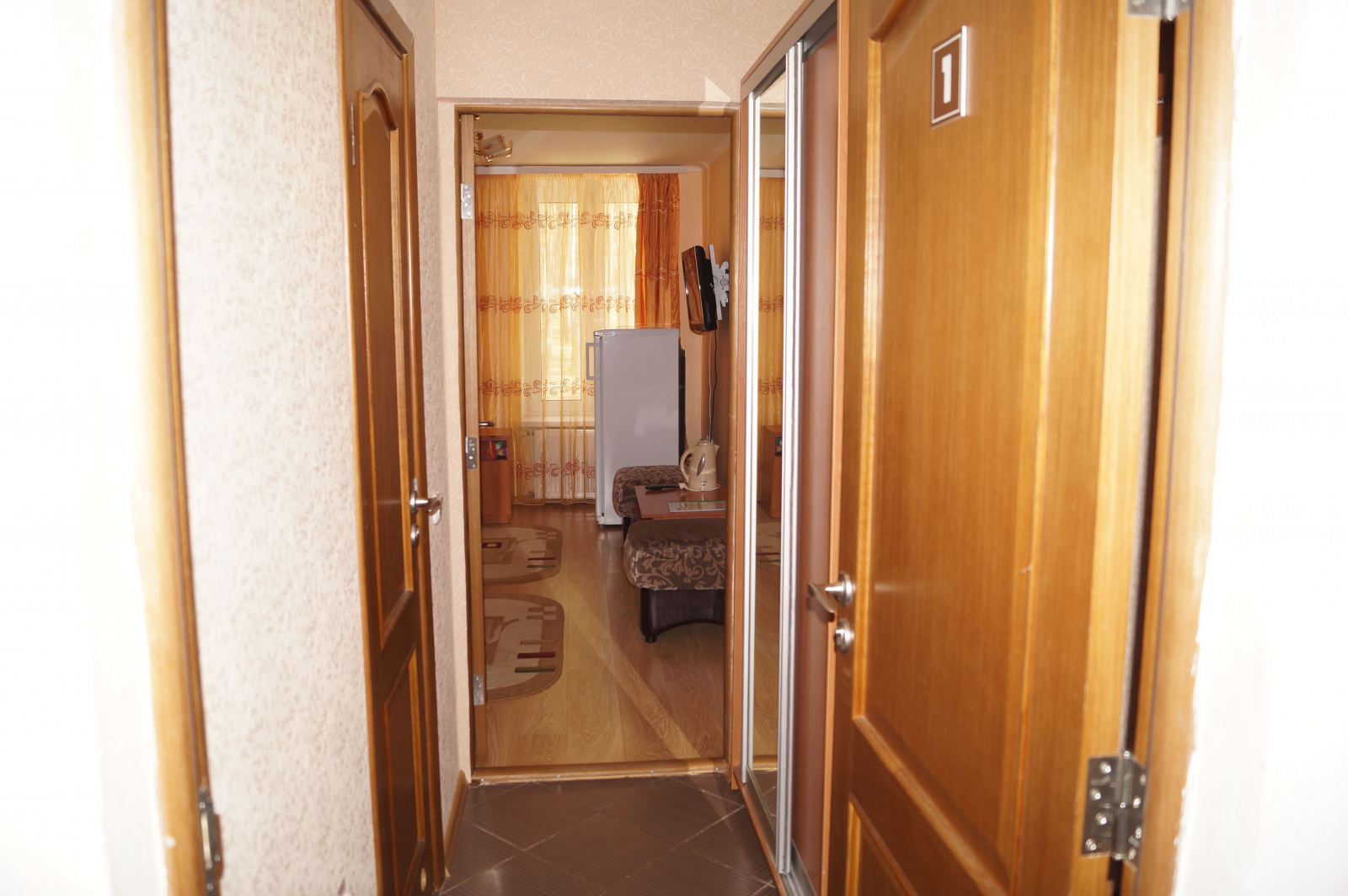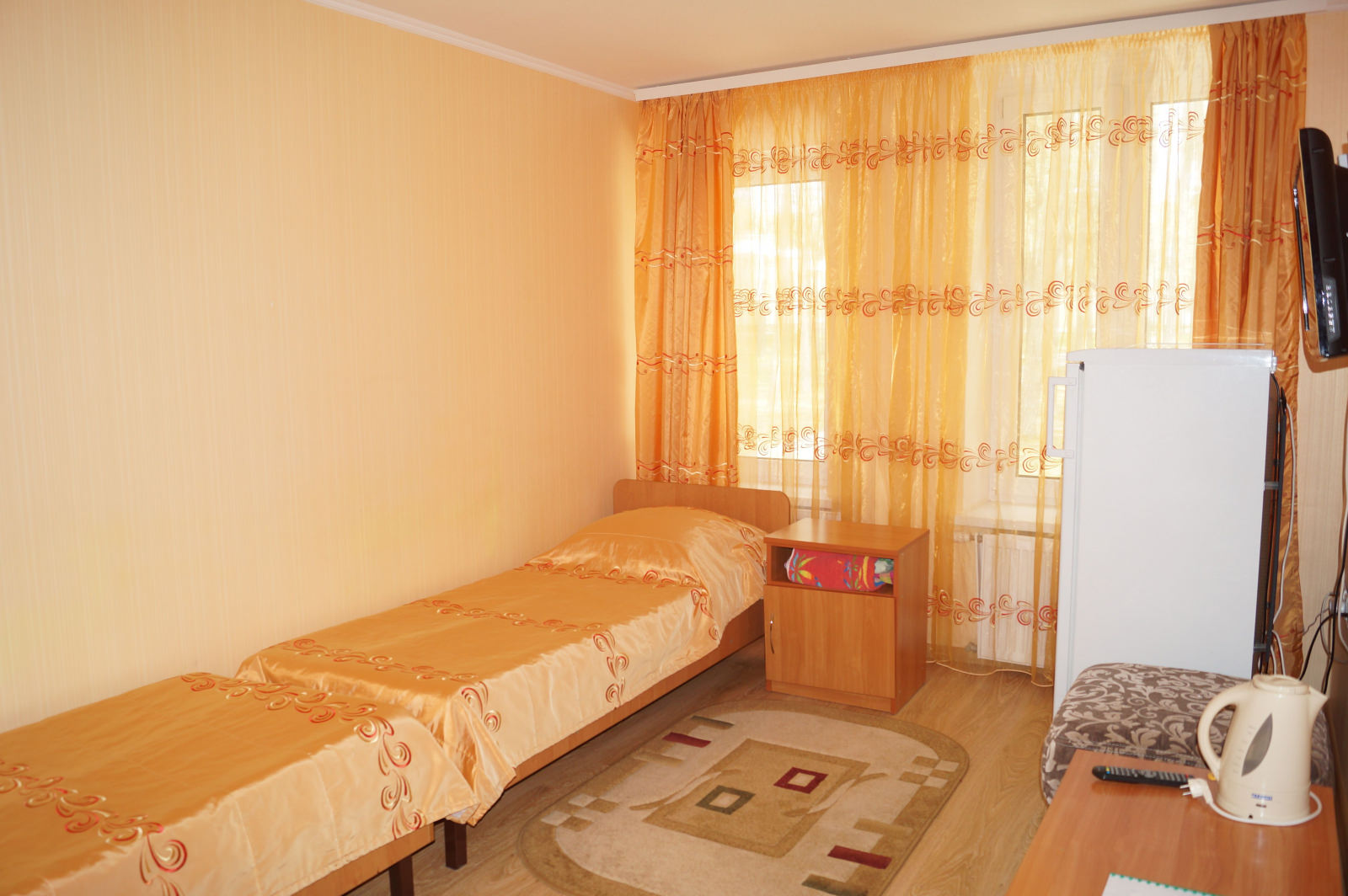 Площадь номера - 18 кв.м. 2 осн. места. 1 доп. место. Мебель: вешалка, зеркало, кровати односпальные, прикроватные тумбочки, стол, стулья, шкаф. Оборудование: набор посуды, телевизор, холодильник, чайный набор посуды, электрочайник. Санузел: с душевой кабиной, туалетные принадлежности. Сервис: смена полотенец, смена постельного белья, уборка номера.
